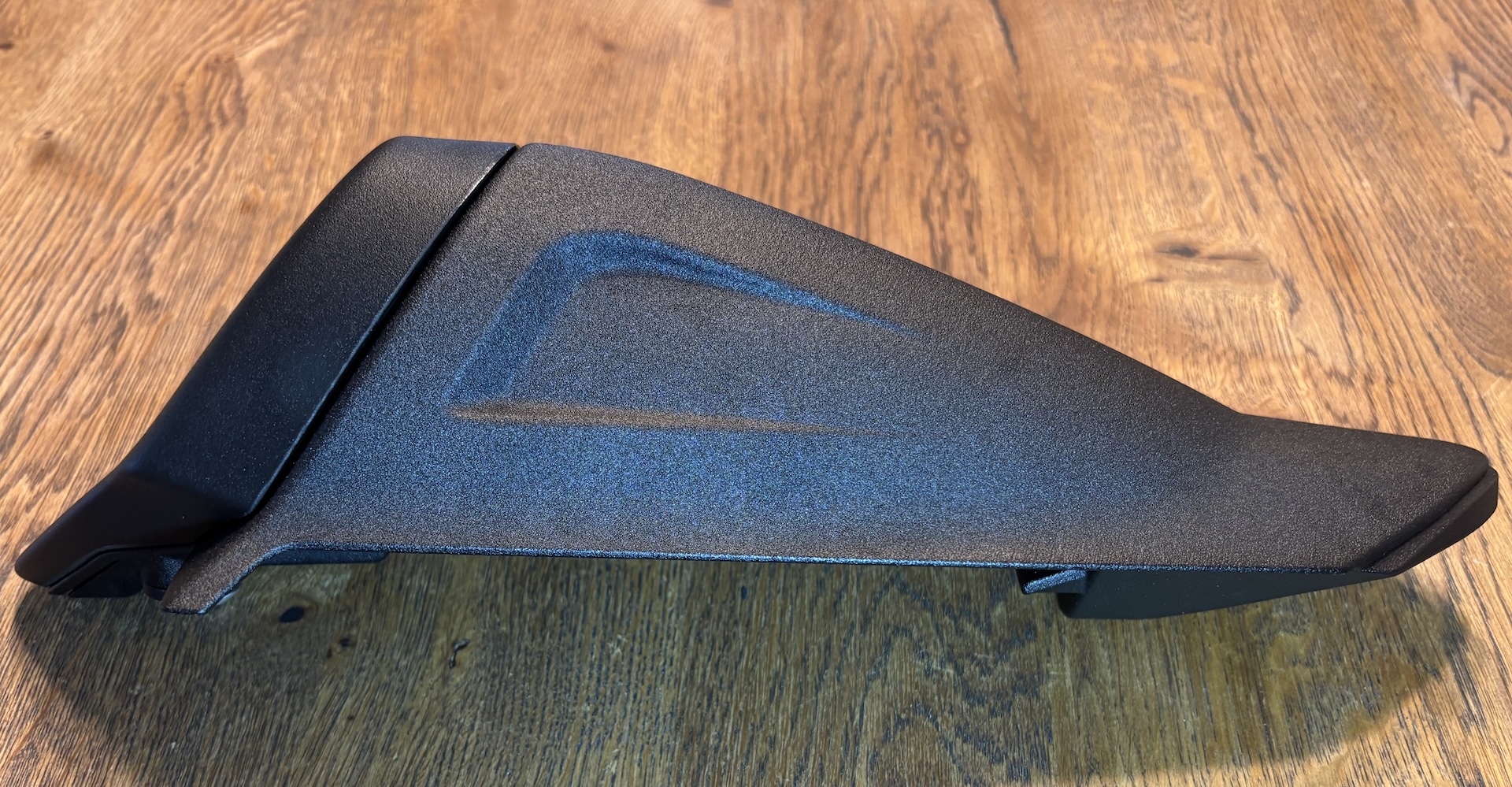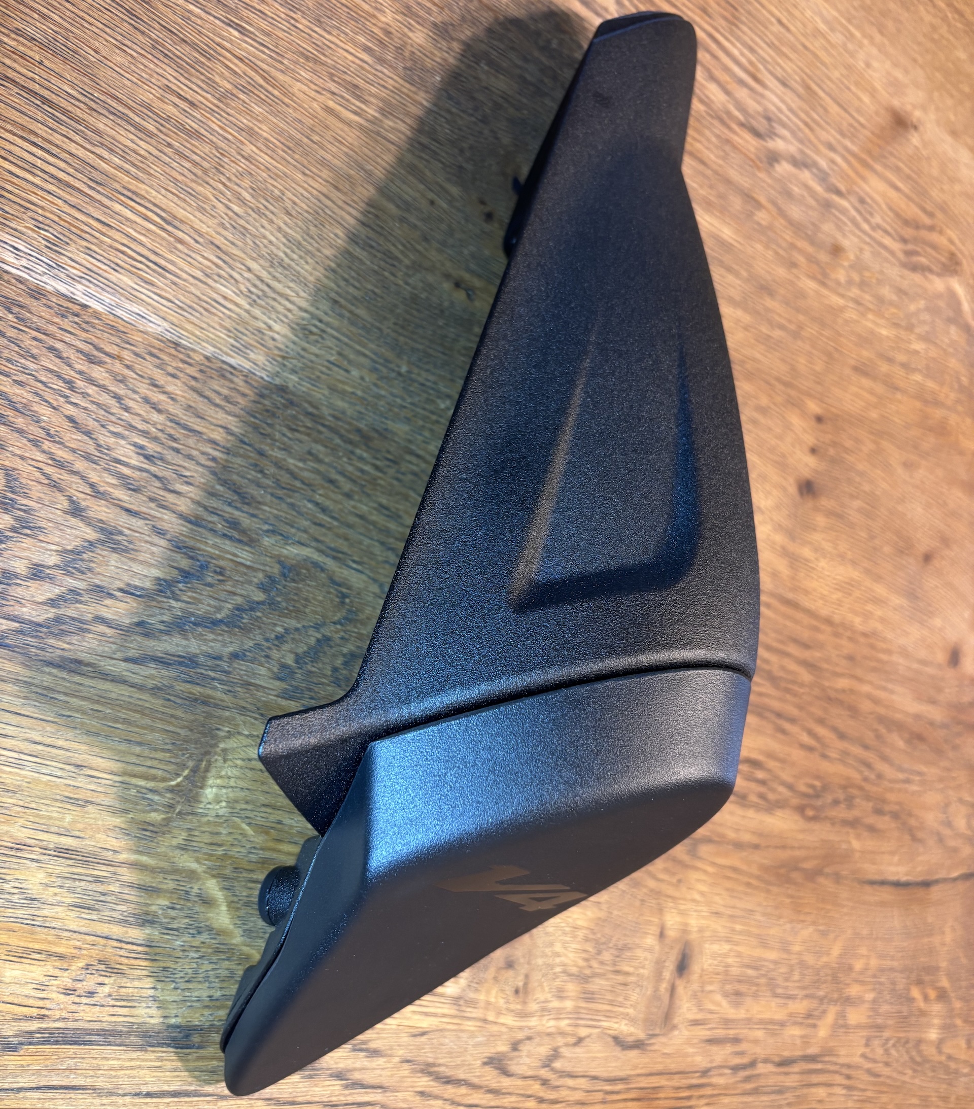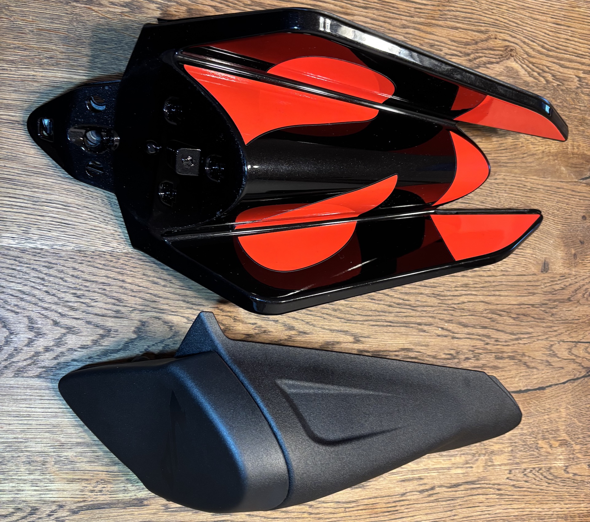 Inside the box are two molded plastic components that are joined together, onto which the original protective pad, rubber elements, screws, and locking pin from the OEM pillion seat cover are transferred. This approach keeps the installation straightforward and fully reversible, maintaining factory mounting points and functionality without permanent modification.