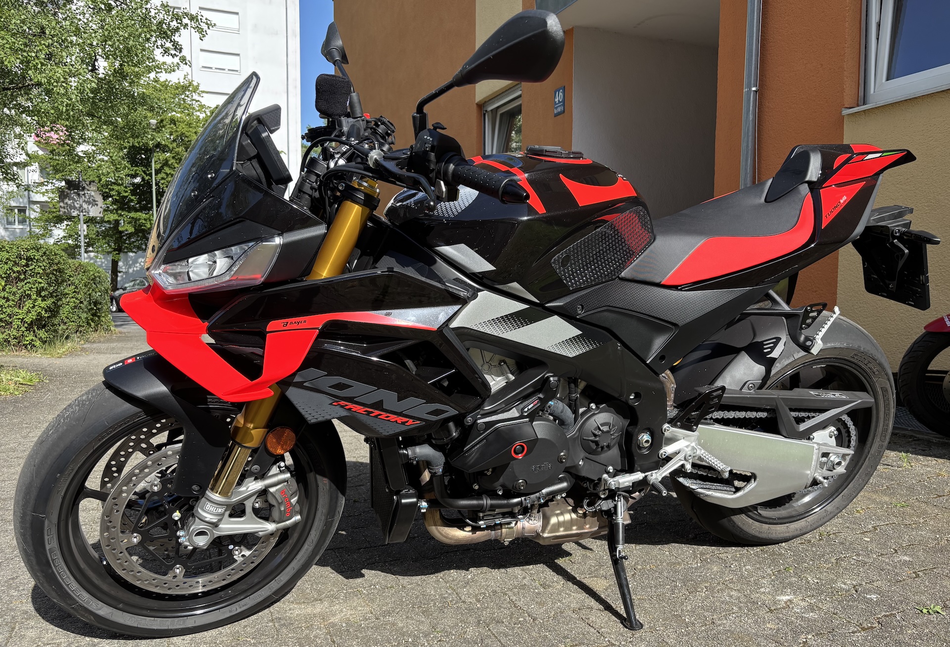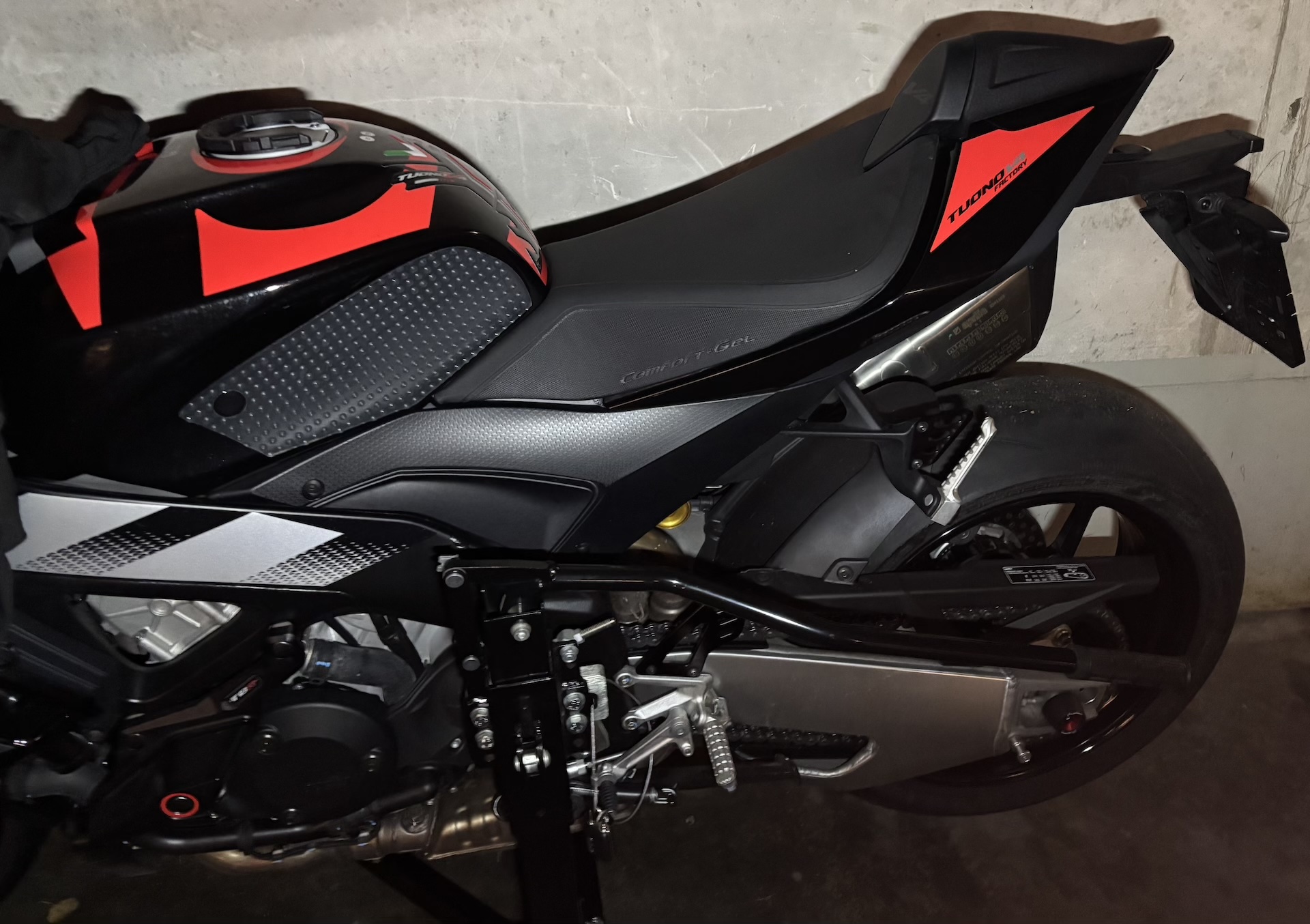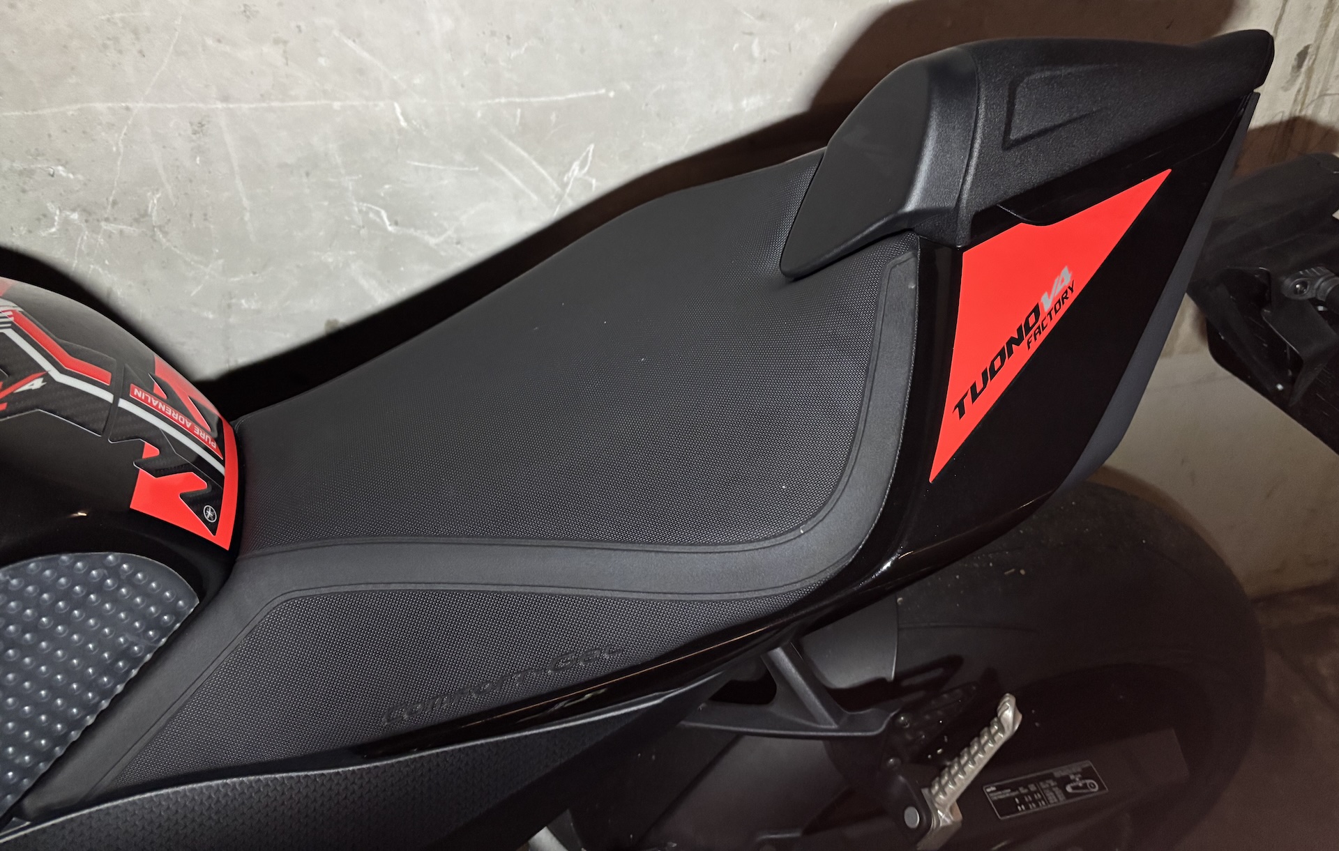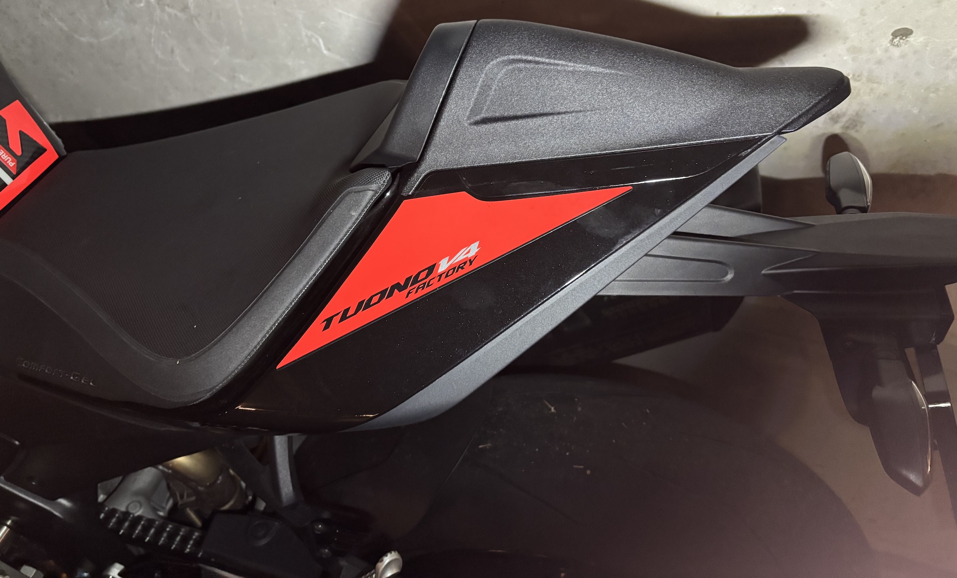 If you’re not familiar with Aprilia’s original pillion seat cover with its distinctive stegosaurus finlets, this is how it looks in practice. With winter still in full swing in Germany, the bike remains parked for now, but more appealing outdoor photos will follow once spring arrives.