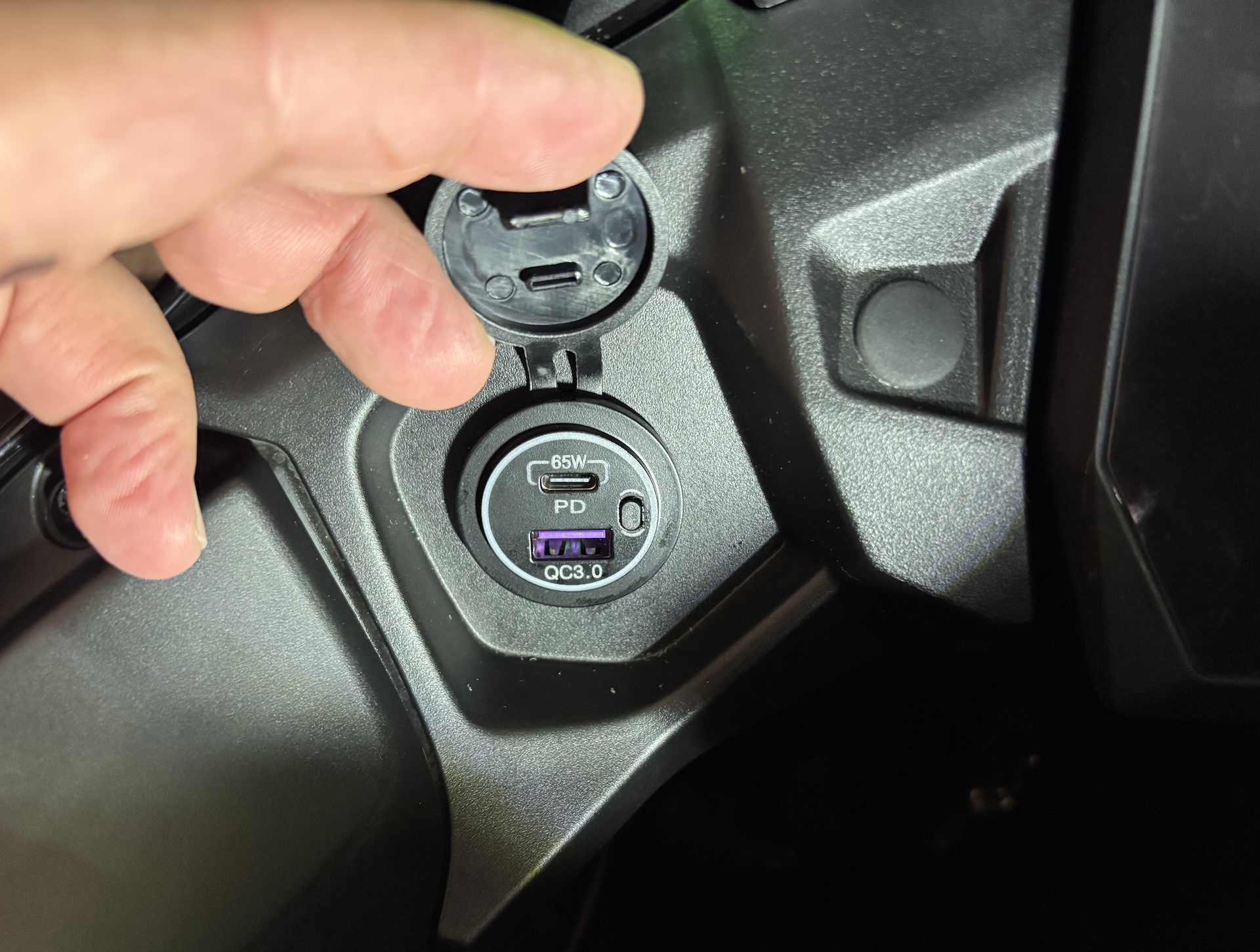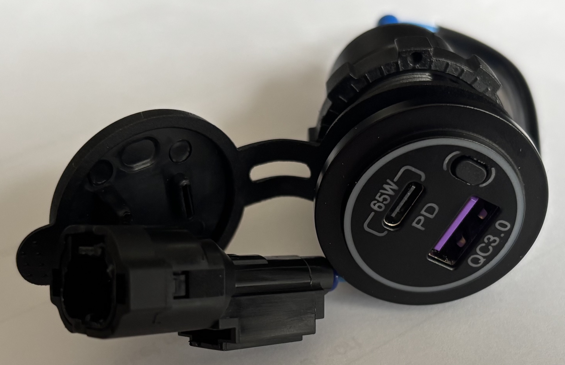 I checked which wire was positive and which was negative, labeled the terminals, and completed the wiring and installation. The USB charger was purchased from AliExpress and is supposedly rated at 83 W total output — 65 W from the USB-C port and 18 W from the USB-A port. Honestly, this is how the motorcycle should have come from the factory, not with an outdated cigarette lighter socket.