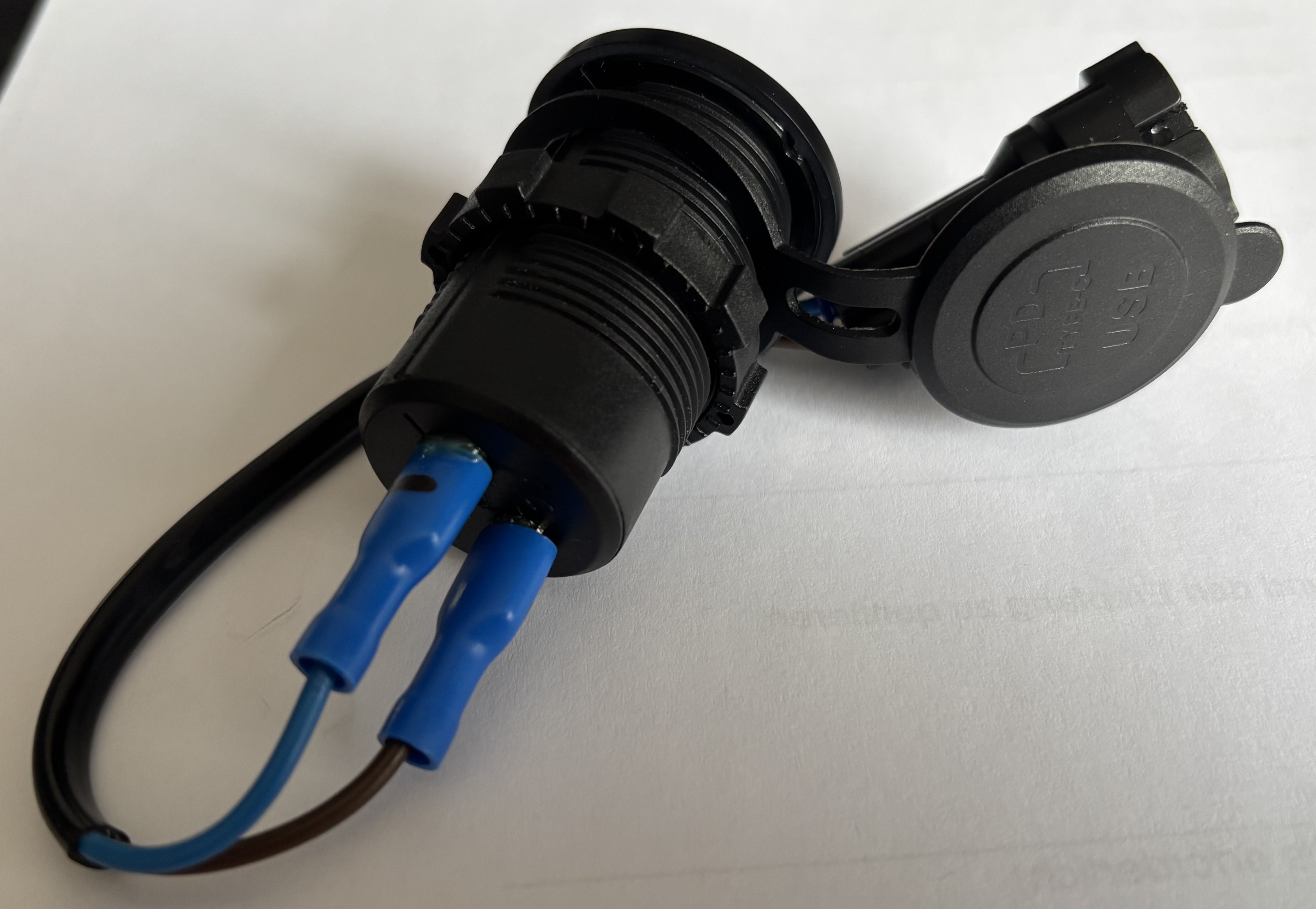 In the first two photos, you can see the original cigarette lighter socket as well as all the materials needed for the new setup. Unfortunately, the USB charger’s diameter is about 1 mm larger than the original socket, so I had to slightly widen the hole with a file. However, I used a new power connector identical to the factory one, which means I didn’t have to cut or damage any of the motorcycle’s wiring — I simply connected the USB charger to the existing connector.
