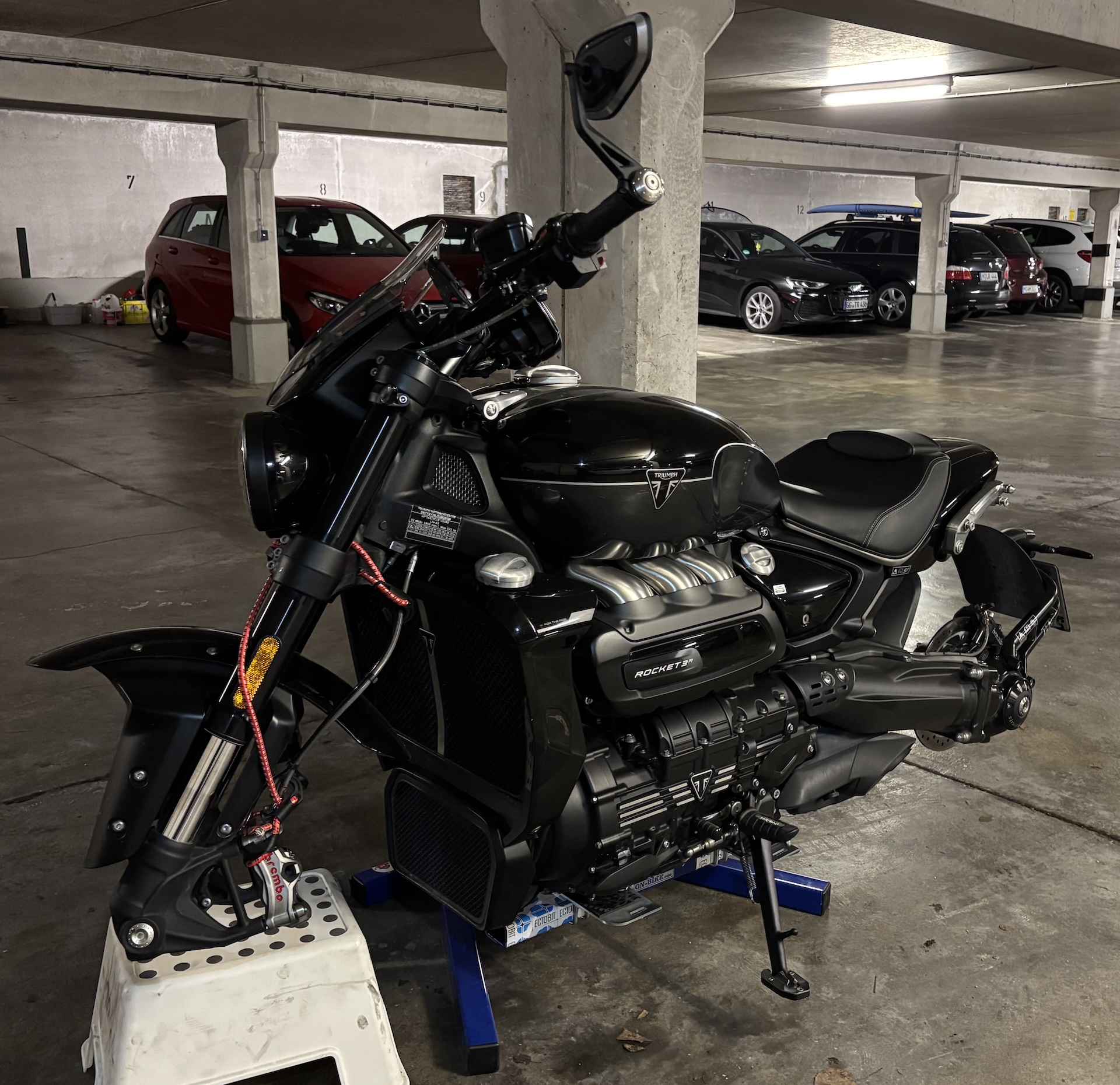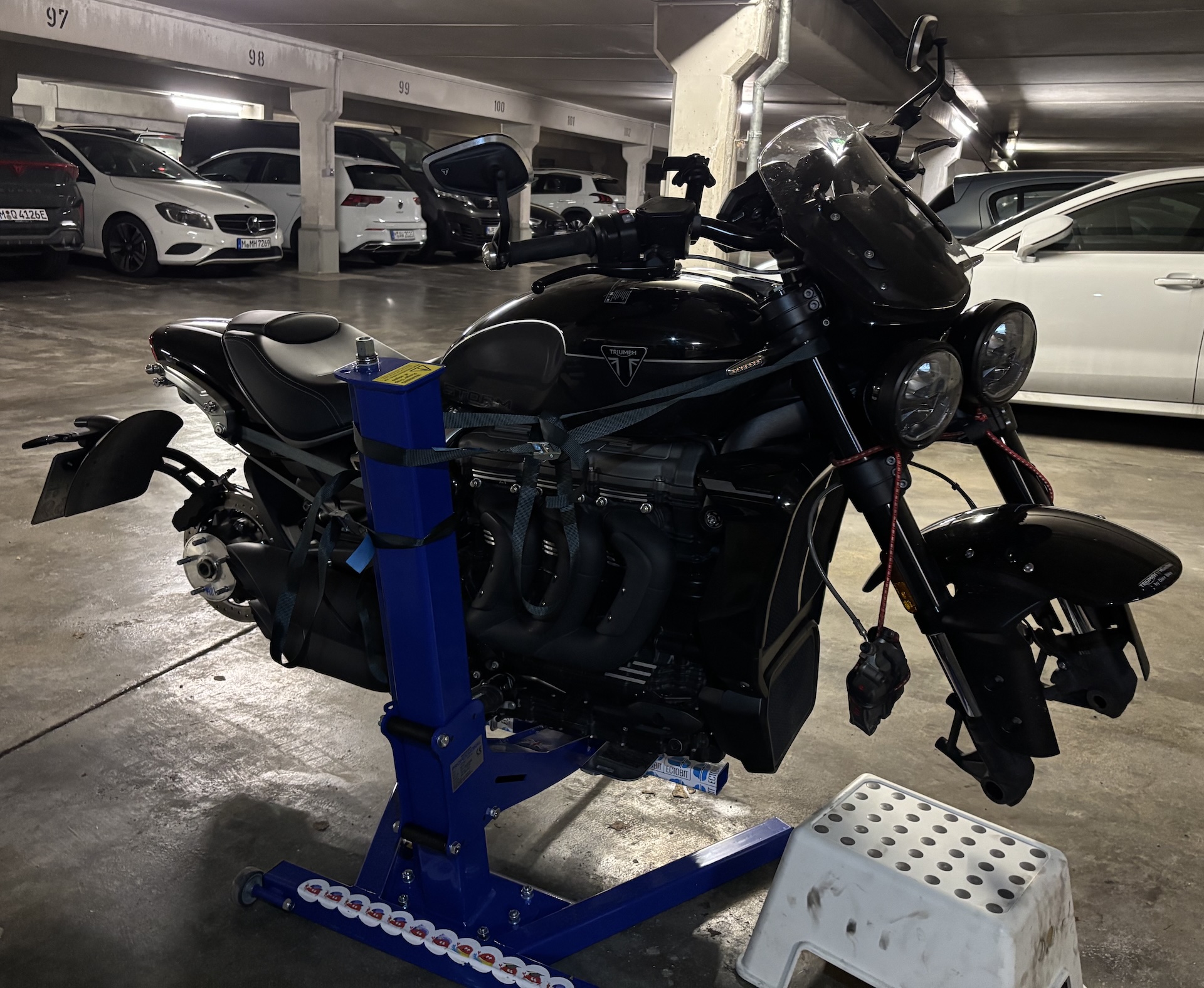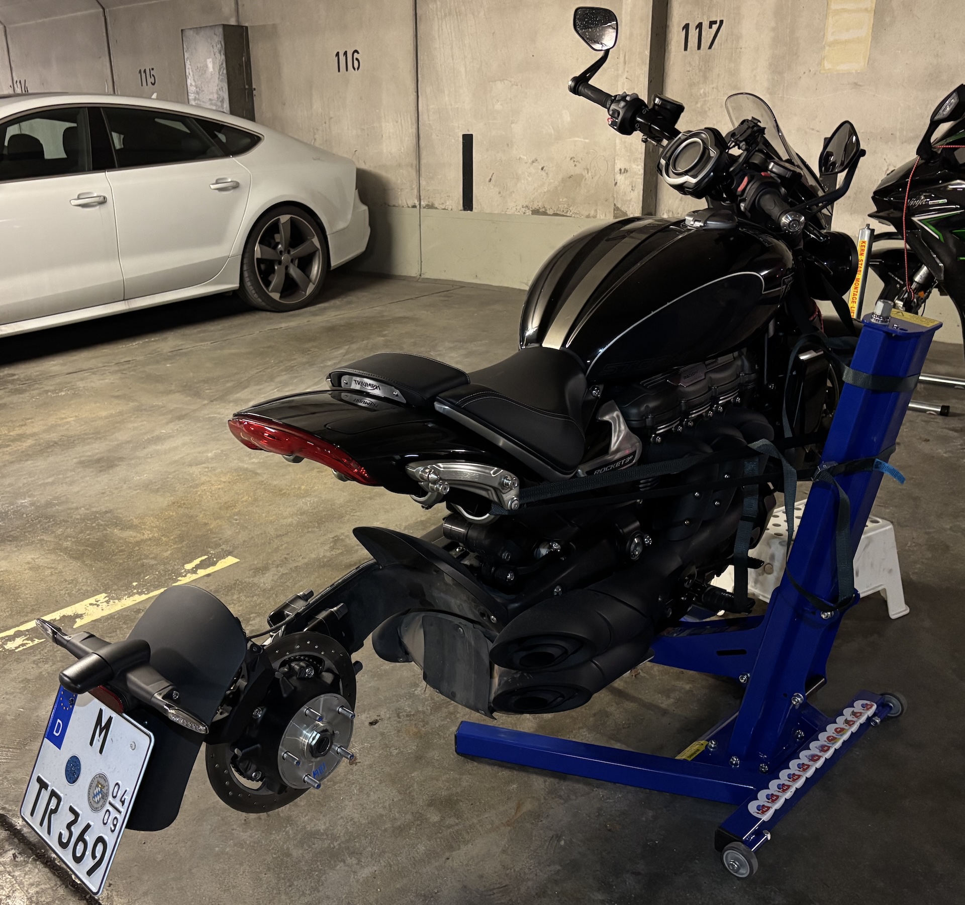 Although I own two motorcycles, by the end of May this year the tires on both were worn out and needed replacement. As I mentioned before, for lifting the Triumph Rocket 3 Storm R I had previously acquired the EazyRizer Big Blue lift, while for the Kawasaki H2 SX SE the Kern-Stabi Spindle Stand X4 2049 front stand was sufficient. I won’t go into the procedure itself, you can find plenty of detailed videos on YouTube and other websites, but I wanted to share a few photos showing how the process looked in my case. The conclusion is straightforward: both lifts performed their intended functions effectively, allowing me to remove the wheels without much effort, take them to a tire shop for replacement and balancing, and then reinstall them on the motorcycles.